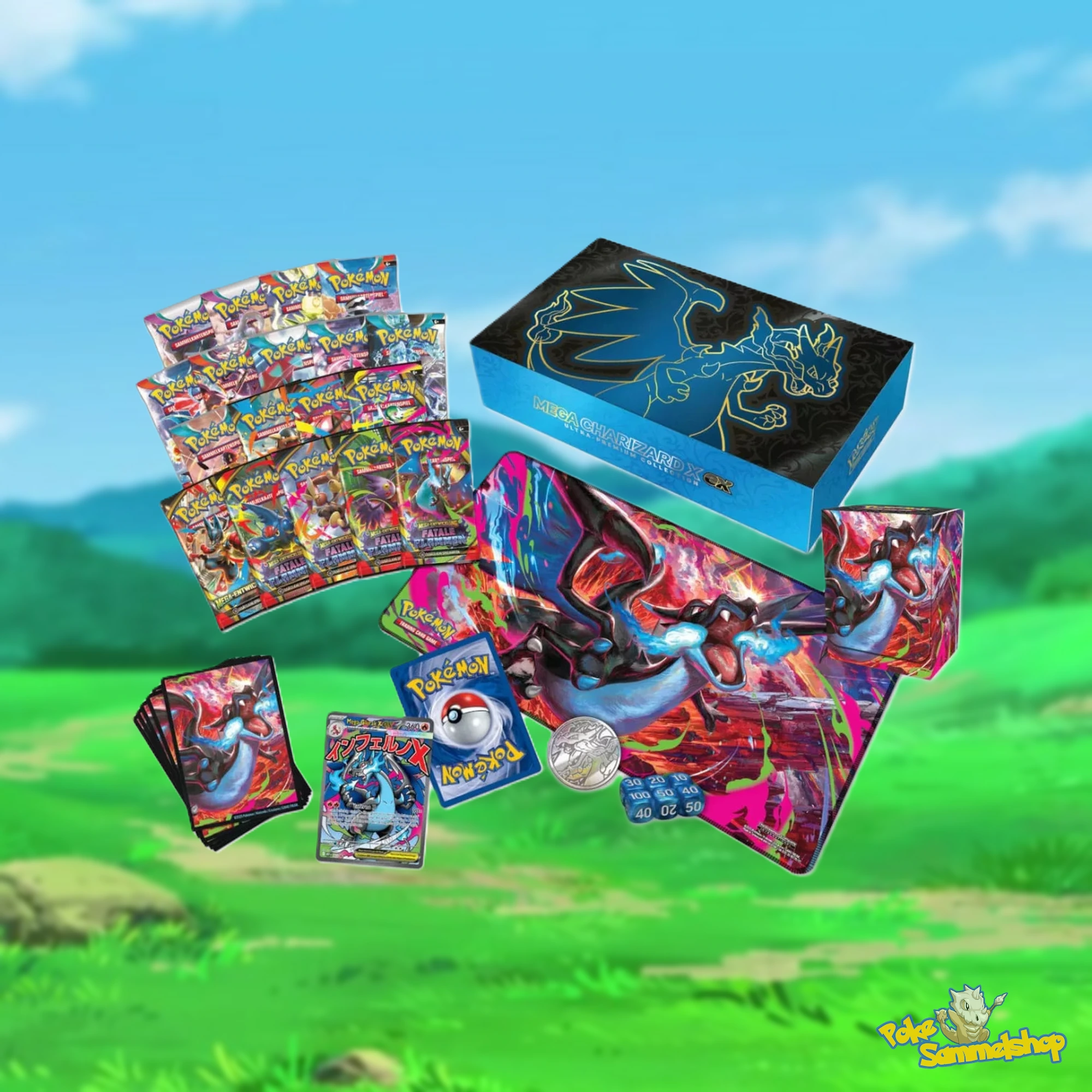 Entfessele die blaue Flamme von Mega Glurak X ex mit der Pokémon „Mega Glurak X ex Ultra Premium Kollektion“ (DE)! Premium-Zubehör, exklusive Promos und ein satter Mix aus 18 Boostern – perfekt zum Öffnen, Organisieren und Präsentieren.